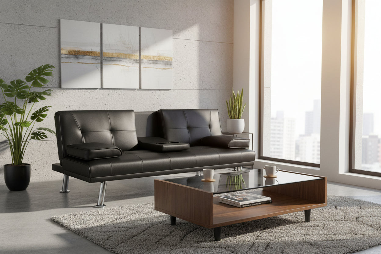 This modern PU upholstered futon converts easily into a bed. Features removable armrests, metal legs and 2 cupholders for comfort and convenience in living rooms and small spaces.